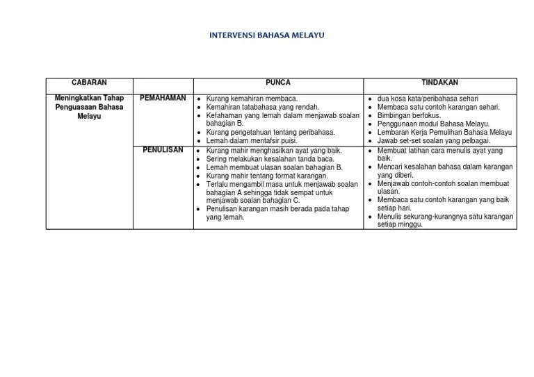 Pelan intervensi bagi subjek bahasa melayu. Mata pelajaran ujian saringan mengenal pasti murid linus ujian 2. Meningkatkan keupayaan dan tahap penguasaan kemahiran . Program intervensi bahasa melayu tahun 4 intelek 2013 pelajar lemah â· program pengukuhan bacaan :